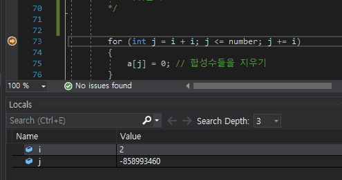위처럼 2의 배수, 3의 배수 등등 어떤 소수의 배수들로 j가 초기화 되고, 그런 j들을 배열에서 지워준다