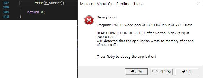 동적 할당을 하는 프로그램을 만들던 도중, free() 함수를 실행할때 에러 발생