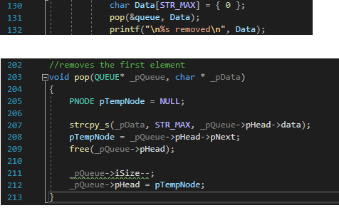 pop의 인자로 배열을 input 으로 넣고 해당 배열에 data를 복사하도록, 그리고 주소를 대입하는게 아닌, strcpy_s를 사용해 실제 문자열을 복사하도록 했다