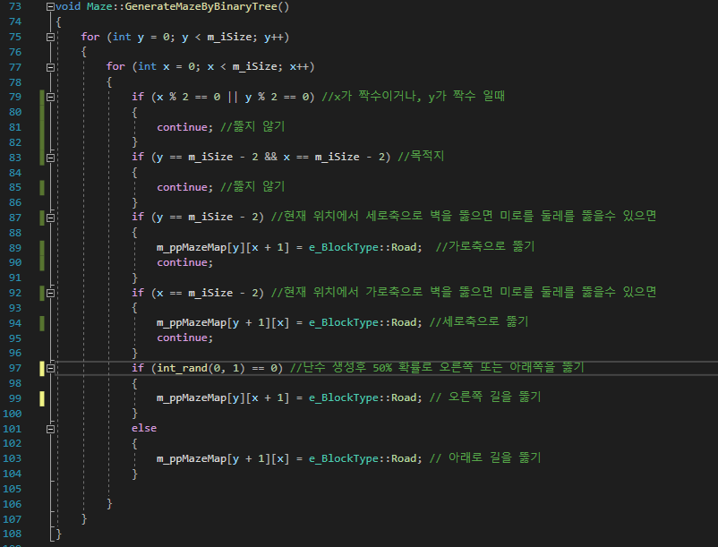 난수를 생성해서 50% 확률로 미로를 파는 방향을 정함