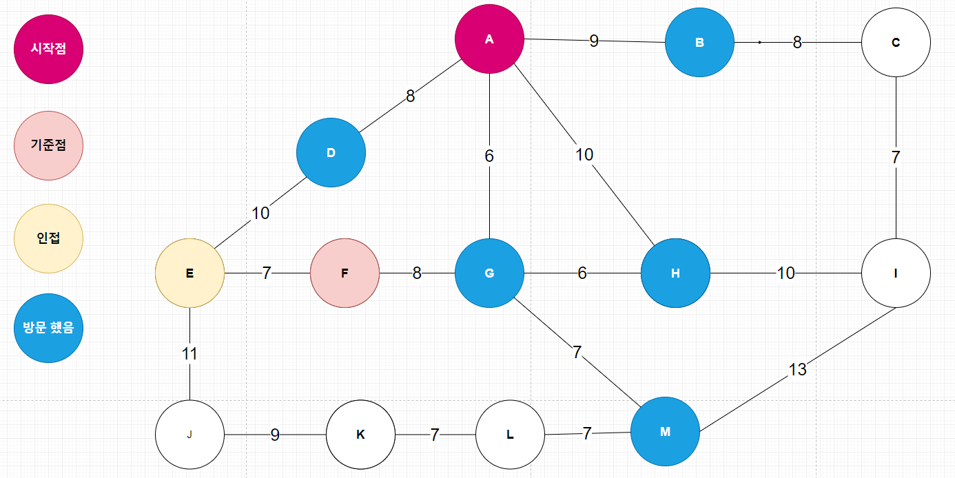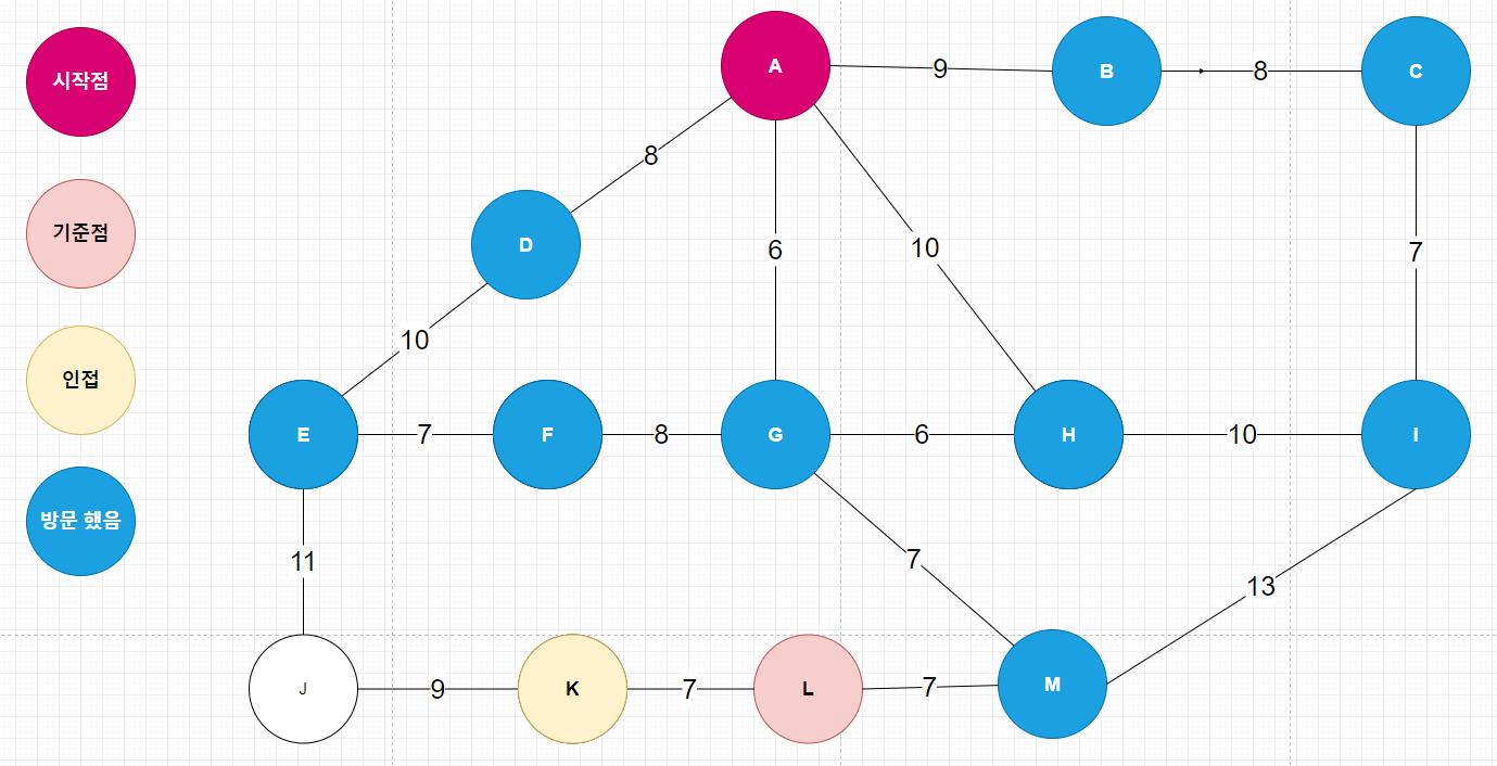 예를들면 A(시작점) 에서 정점 K 까지 간다고 했을때, A -> D -> E -> J -> K로 거쳐서 갈 수도 있겠지만