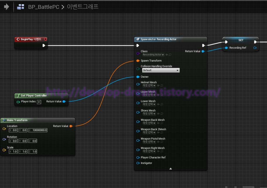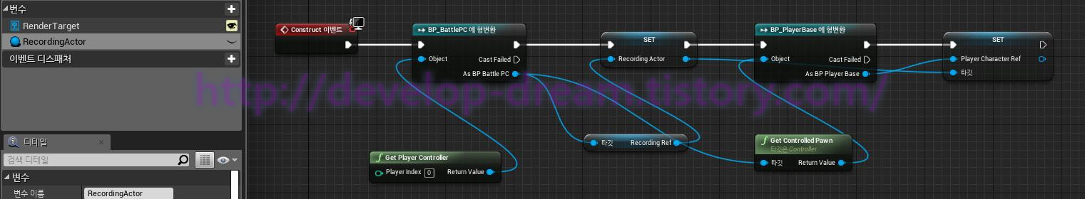 6.아까 만든 WidgetBP 에선 Construct 이벤트시 playerController가 가지고 있는 RecordingActor 레퍼런스를 변수로 승격하여 가지고 있는다 또한 GetControlledPawn을 통해 PlayerCharacter를 가지고 온후 RecordingActor의 변수로 가지고 있는 playerCharacter에 Set 시킨다