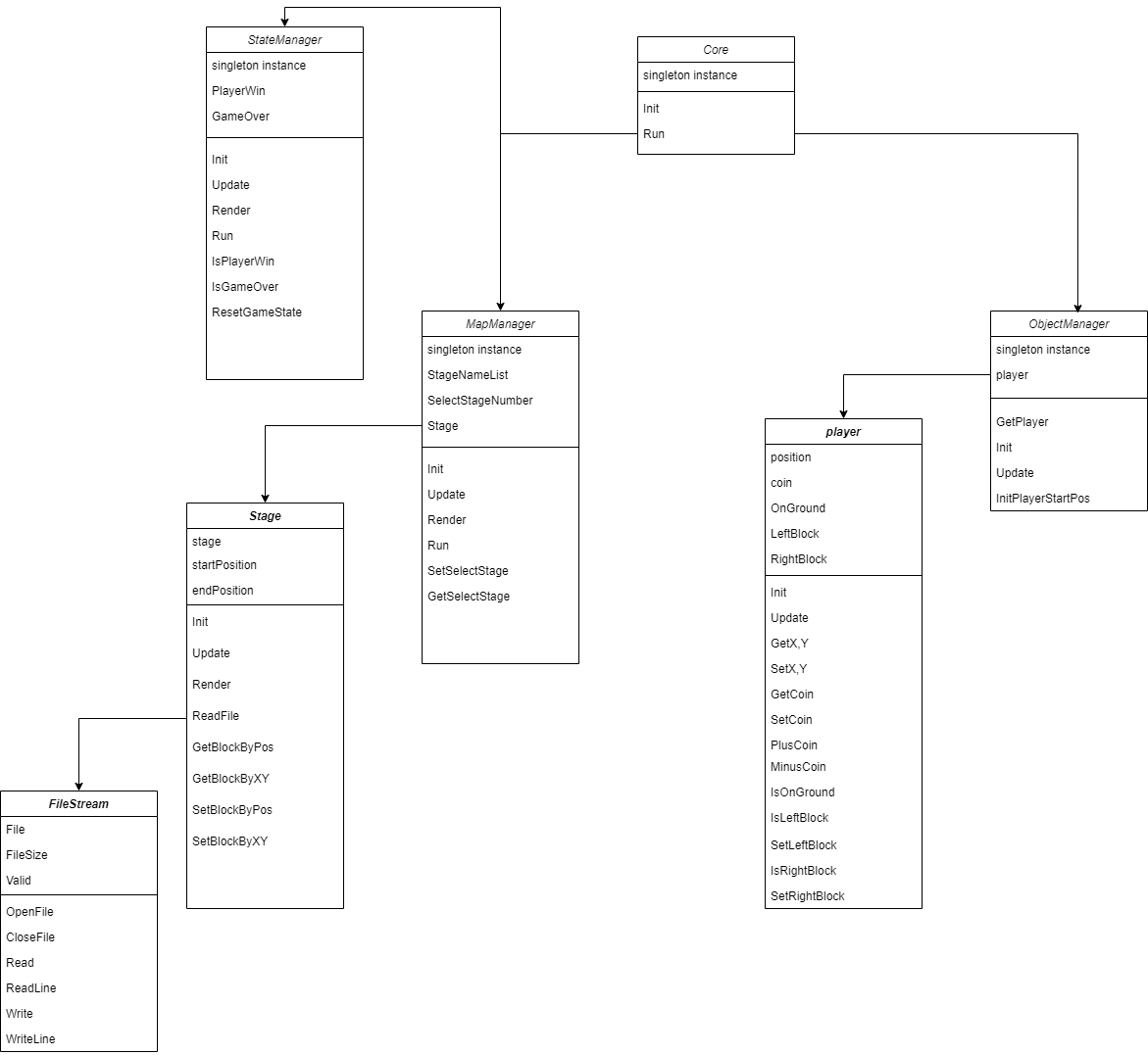 Player : 코인점수 관리, 플레이어 떨어졌는지, 허공에 있는지 여부 확인, 왼쪽, 오른쪽에 벽이 있는지 확인